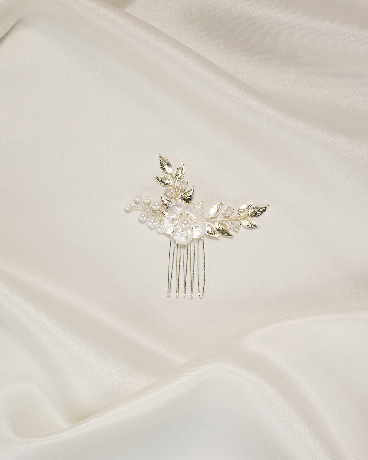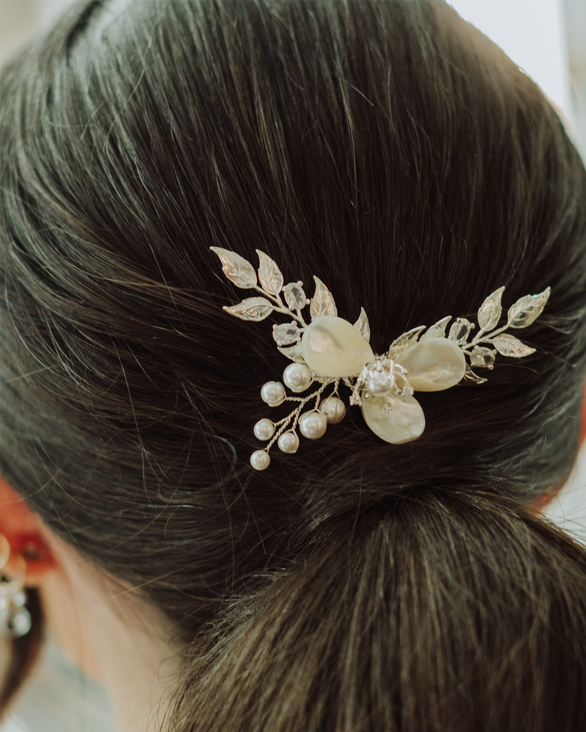 Material: Flor de concha nácar, hojas de metal tono plata, cristales y perlas.