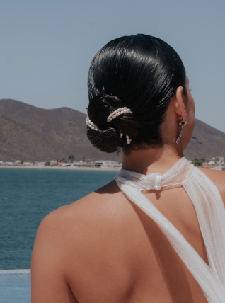 Cada perla ha sido elegida a mano por su forma y brillo únicos, dando como resultado una pieza sutil y versátil que puedes llevar como corona, entrelazada en una trenza o rodeando un chongo.